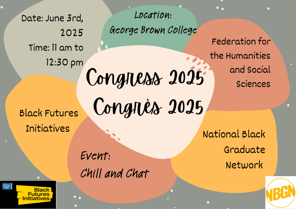In the winter 2025 semester, Emmanuel worked with long-term NBGN member and organizer Cherie A. Daniel to develop a collaboration with Mary Ola, Senior Manager of the Black Futures Initiative at George Brown College. George Brown was the host institution for this year’s Congress of the Humanities and Social Sciences. Working in collaboration with Mary Ola and the support of her office, Emmanuel co-organized an NBGN Chill & Chat event to be held during the Congress, open and free of charge to all attendees and the public at large.