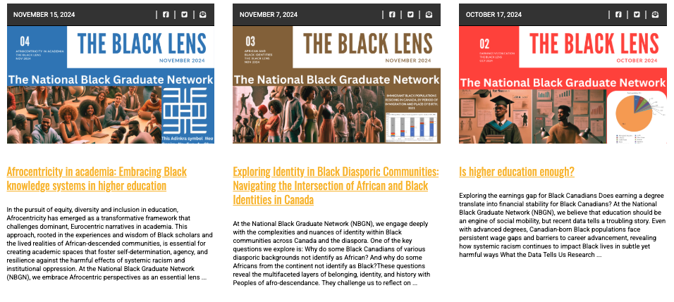 I am especially grateful to the PhD students who have worked with me as Graduate Assistant members of the NBGN leadership team and have directly shaped its current form and futures: Cherie Daniel (OISE, UofT), Julian Kapfumvuti (MUN), Jamilah Dei-Sharpe (Concordia), Festus Ajayi (MUN), marcus singleton (OISE, UofT), Aayah Amir (OISE, UofT), Danielle Cantave (OISE, UofT), and Emmanuel Rutayisire (OISE, UofT). I’d also be remiss not to acknowledge my colleague Dr. OmiSoore Dryden, with whom I served as co-president of the Black Canadian Studies Association from 2019-2021. Dr. Dryden was my key interlocutor in developing the idea for a national network for black grad students, and it was with generous funding support from Dr. Dryden in her role as James R. Johnston Endowed Chair in Black Canadian Studies that we were able to develop the NBGN website as an interactive site for online networking and sharing of knowledge.